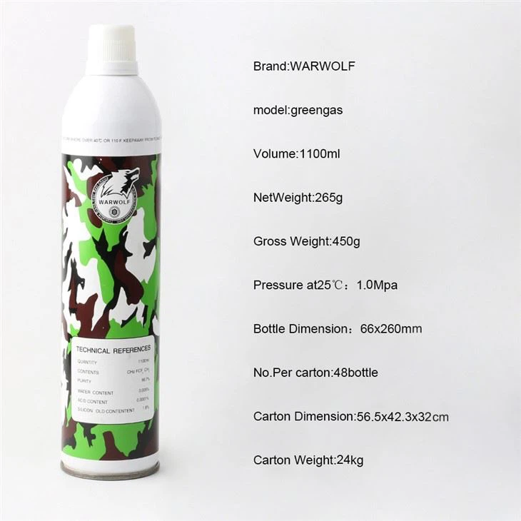 Nuoseklus slėgis Airsoft žaliosios dujos. Specialus C3H8 ir silicio aliejaus mišinys, skirtas pagerinti konsistenciją ir padėti išsaugoti jūsų oro plombas. Šios žaliosios dujos išgyveno 3X kvapo šalinimo procesą, kad pašalintų kvapą, paprastai randamo su kitomis "Airsoft" žaliomis dujomis.